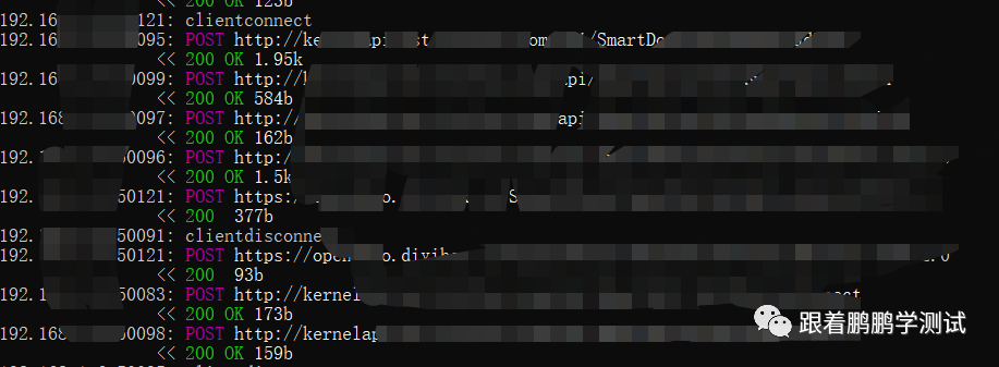 9、证书安装完成后就可以开始抓包了!下面是抓取结果。如果想直接输出入参和出参甚至是把抓取到的数据写入文件中,需要写一些简单的脚本进行输出。python脚本写法下期更新。关注公众号“跟着鹏鹏学测试”。学测试不迷路!