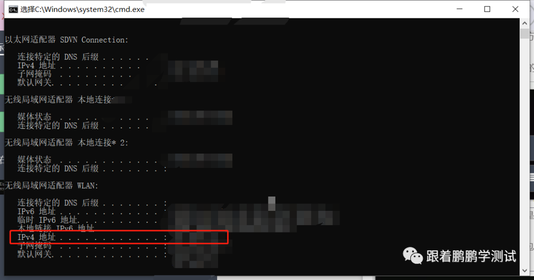 3、输入ipconfig 查看IP地址。(mac是ifconfig)鹏鹏这边连的是WIFI网络所以是在无线局域网适配器这里取得IP地址,如果是网线连接的话取以太网的就可以了。地址取IPv4的地址哦。把IP地址记在小本本中一会要用。