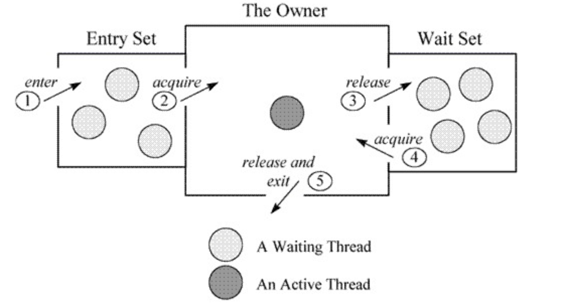 Java 语言对于这样一个典型并发设计模式做了内建的支持,线程如果获得监视锁成功,将成为该监视者对象的拥有者。在任一时刻内,监视者对象只属于一个活动线程 (Owner) 。拥有者线程可以调用 wait 方法自动释放监视锁,进入等待状态。下图很好地描述了 Java Monitor 的工作机理。