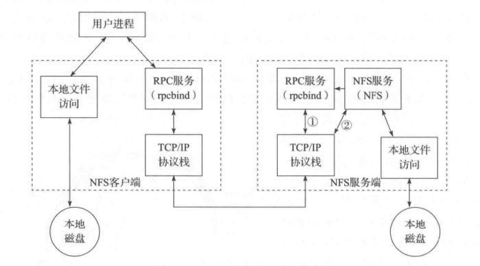 NFS 使用RPC(Remote Procedure Call)的机制进行实现,RPC使得客户端可以调用服务端的函数。同时,由于有 VFS 的存在,客户端可以像使用其它普通文件系统一样使用 NFS 文件系统。经由操作系统的内核,将 NFS 文件系统的调用请求通过 TCP/IP 发送至服务端的 NFS 服务。NFS服务器执行相关的操作,并将操作结果返回给客户端。