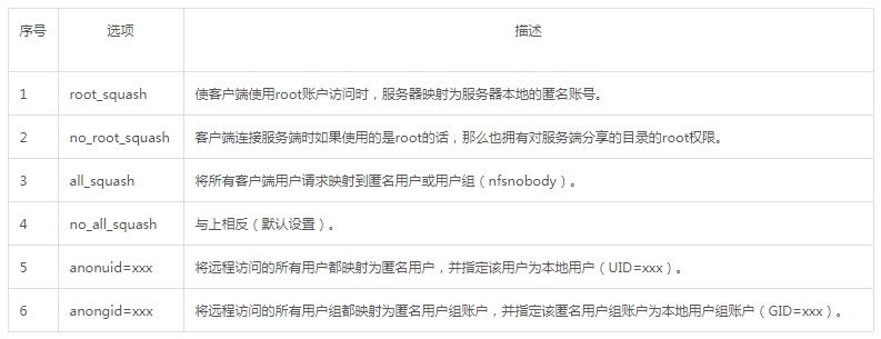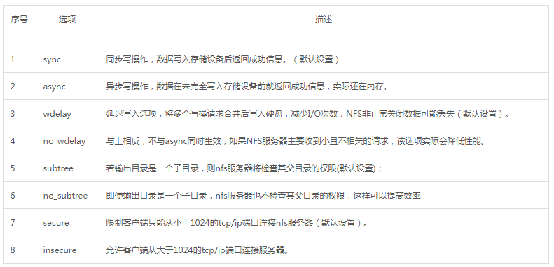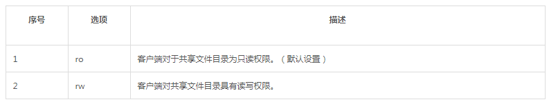 [NFS共享目录] [NFS客户端地址1(参数1,参数2,参数3……)] [客户端地址2(参数1,参数2,参数3……)]