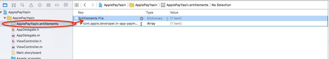 之后项目会多一个Applepay的配置文件ApplePayYasin.entitlements