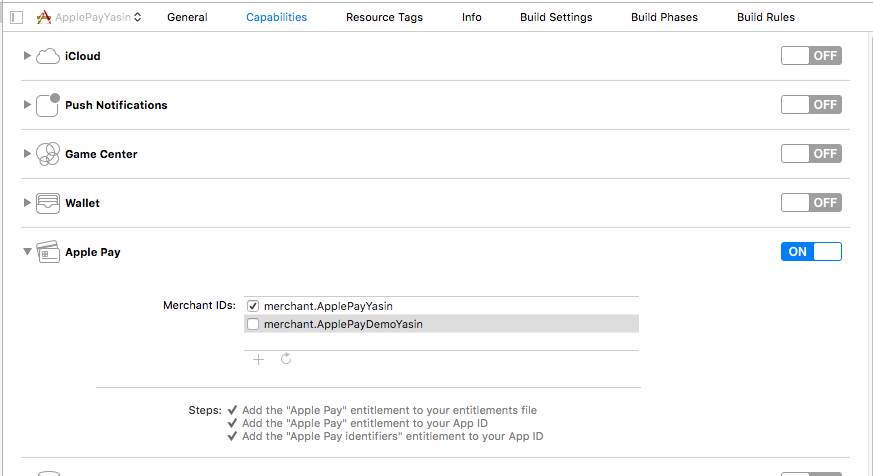 payRequest.merchantIdentifier = @"merchant.ApplePayDemoYasin"; //申请的merchantID