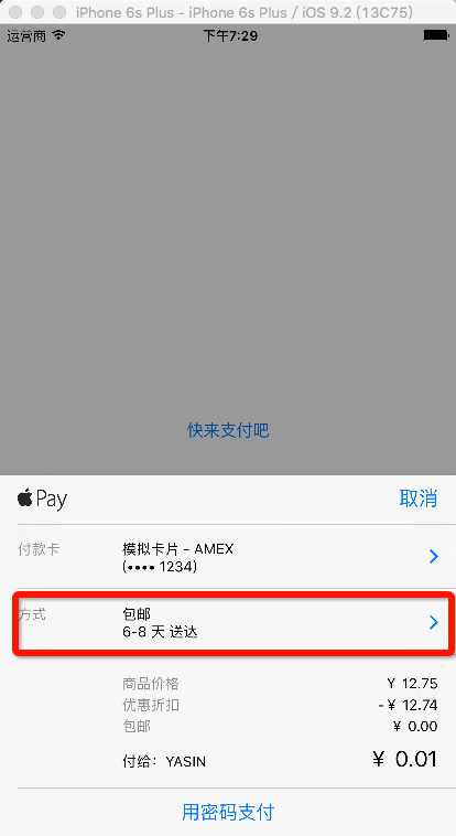 PKPaymentSummaryItem *methods = [PKPaymentSummaryItem summaryItemWithLabel:@"包邮" amount:methodsAmount];