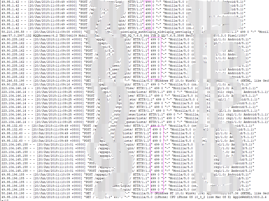 日志记录中HTTP状态码出现499错误有多种情况,我遇到的一种情况是nginx反代到一个永远打不开的后端,就这样了,日志状态记录是499.发送字节数是0. 老是有用户反映网站系统时好时坏,因为线上的产 ...