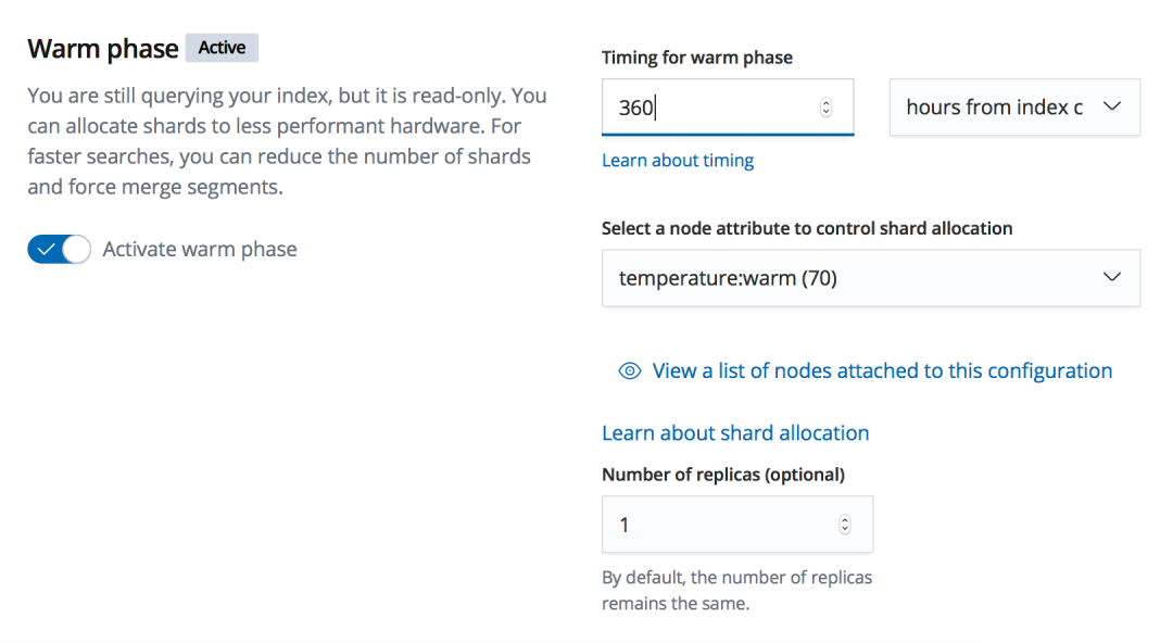 同时,因为副本降低了,索引从 hot 节点迁移到 warm 节点迁移的数据量也减少了一半,从而降低了集群负载,一举两得。