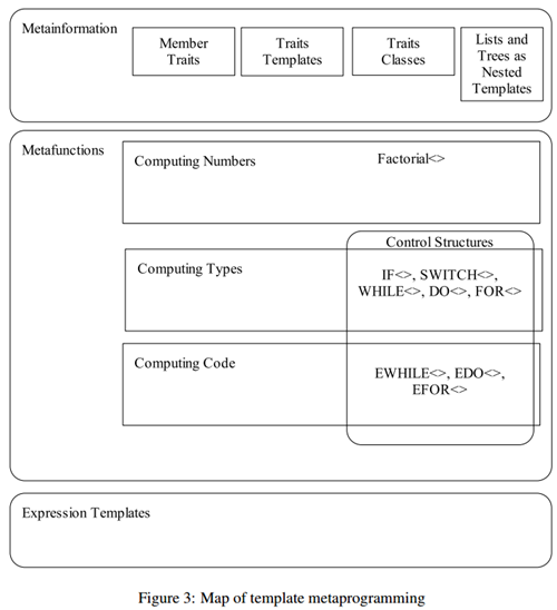 随着模板技术发展,模板元编程逐渐被人们发掘出来,metaprogramming本意是进行源代码生成的编程(代码生成器),同时也是对编程本身的一种更高级的抽象,好比我们元认知这些概念,就是对学习本身更高级的抽象。TMP通过模板实现一套“新的语言”(条件,递归,初始化,变量等),由于模板是图灵完备,理论上可以实现任何可计算编程,把本来在运行期实现部分功能可以移到编译期实现,节省运行时开销,比如进行循环展开,量纲分析等。
