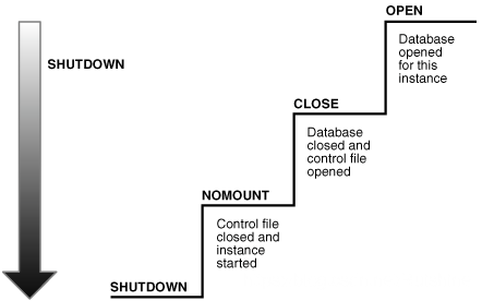 从上图可以看出库Oracle从shutdown状态到open状态经历以下阶段: