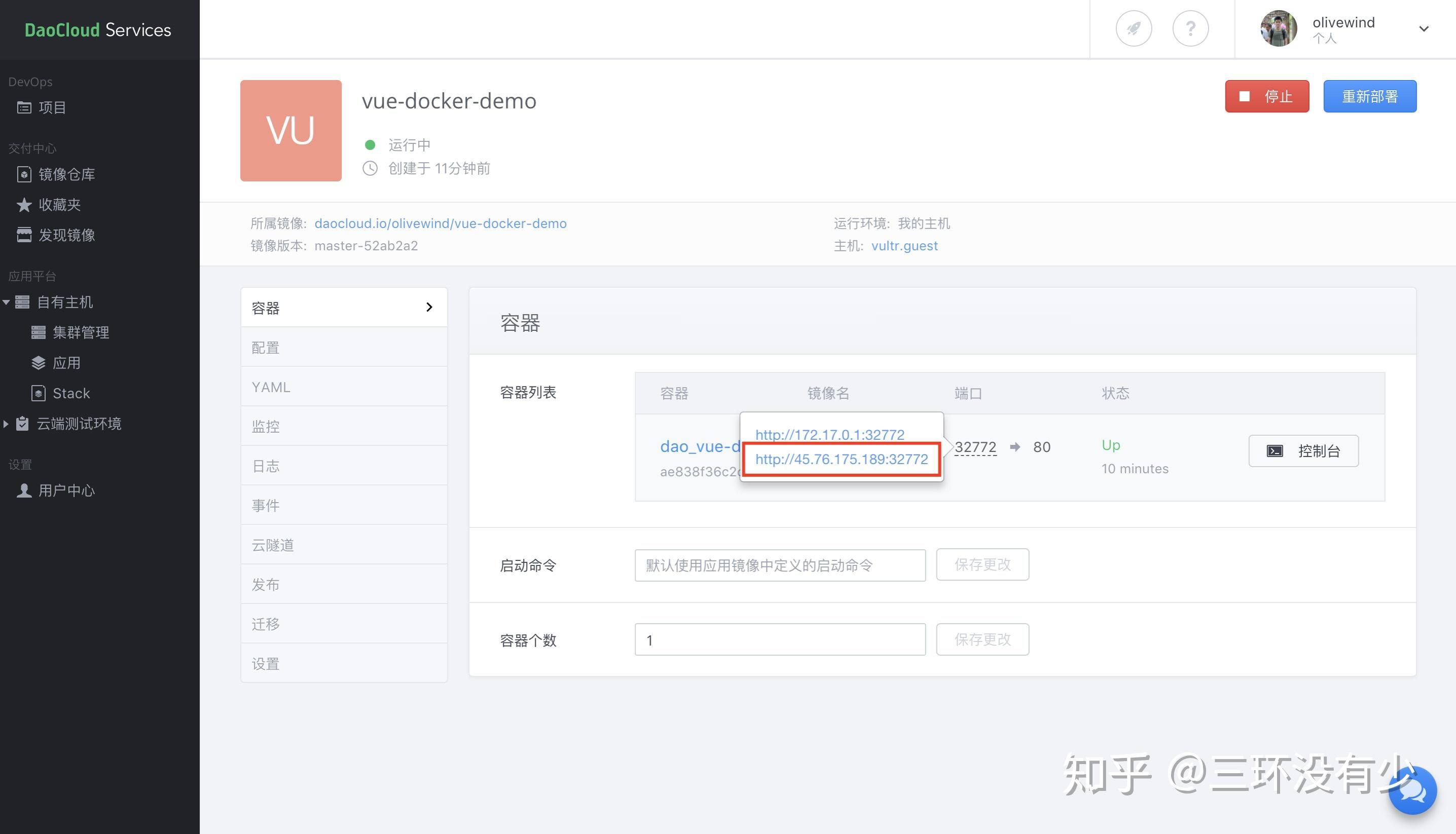等待完成镜像拉取,待容器列表中的容器起来后,通过地址查看我们部署的应用