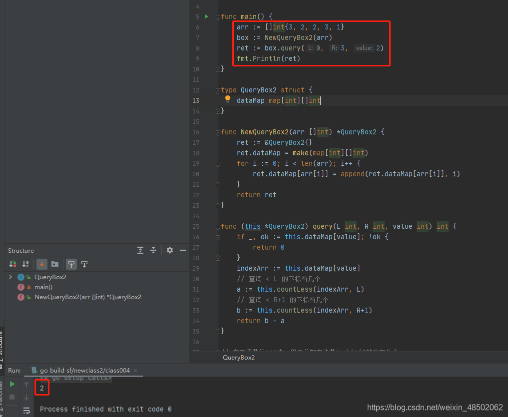 2021-05-15:数组为{3, 2, 2, 3, 1},查询为(0, 3, 2),意思是在数组里下标0~3这个范围上,有几个2?答案返回2。假设给你一个数组arr, 对这个数组的查询非常频繁,都给出来。请返回所有查询的结果。