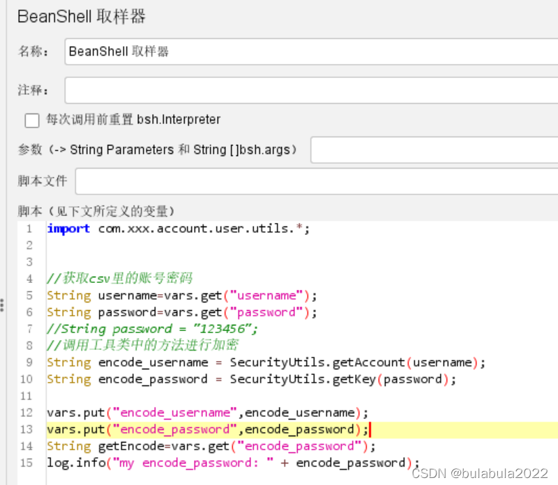 在bean shell中通过source("代码路径")方法引入java,然后调用方法和java一样。