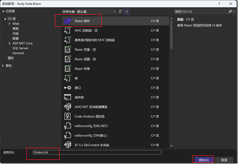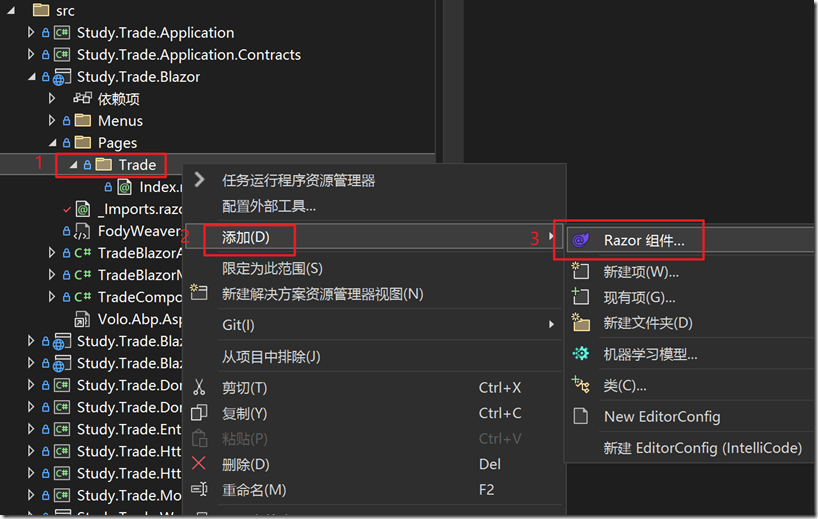 如下图,在Pages/Trade目录上点右键,选择“添加”,再选择“Razor组件……”: