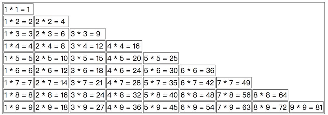 一.打印九九乘法表图形为下列效果图中的三角型的一种例: 图一效果1*1=1 1*2=2 2*2=4 1*3=3 2*3=6 3*3=9 1*4=4 2*4=8 3*4=12 4*4=16 1*5=5 ...
