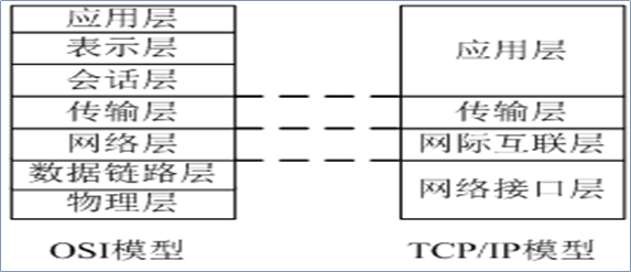 基于TCP/IP的参考模型将协议分成四个层次,它们分别是网络接口层、网际互连层(IP层)、传输层TCP层和应用层。如图为TCP/IP跟OSI参考模型层次的对比: