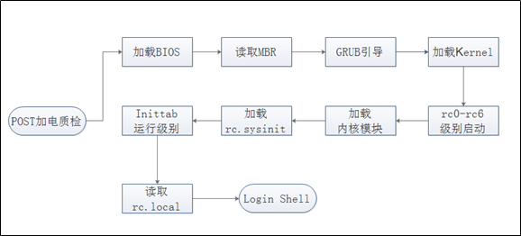 初学者对Linux操作系统启动流程的理解,能有助于后期在企业中更好的维护Linux服务器,能快速定位系统问题,进而解决问题。Linux操作系统启动流程如图所示: