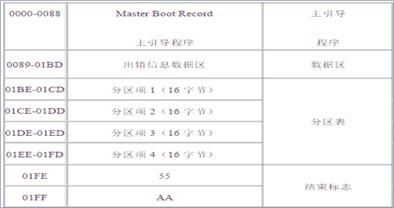 主引导扇区总共为512字节,MBR只占用了其中的446个字节,另外的64个字节为[硬盘分区表(Disk Partition Table,DPT),最后两个字节“55,AA”是分区的结束标志。