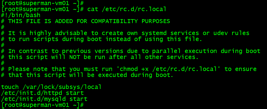 操作系统启动完相应服务之后,会读取执行/etc/rc.d/rc.local文件,可以将需要开机启动的任务加入到该文件末尾,系统会逐行去执行并启动相应命令,如图3-6所示: