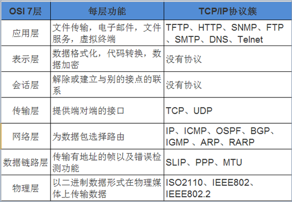 OSI模型与TCP/IP模型协议功能实现对照表,如图所示: