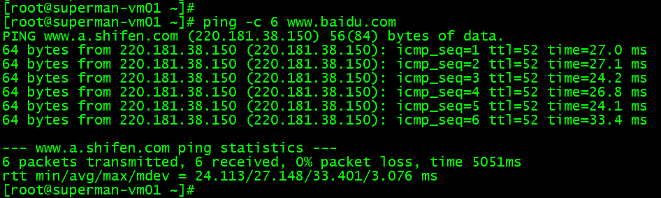 可以ping -c 6 www.baidu.com查看返回结果,如果有IP返回,则表示服务器DNS配置正确,如图所示: