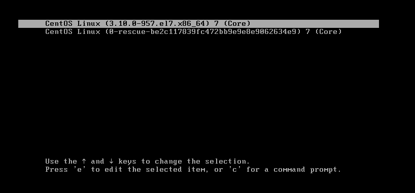 1、 Reboot重启系统,系统启动进入欢迎界面,加载内核步骤时,按e,然后选中“CentOS Linux (3.10.0-957.e17.x86_64)7 (Core)”,如图所示: