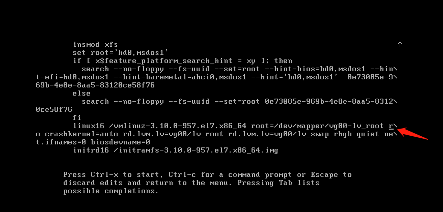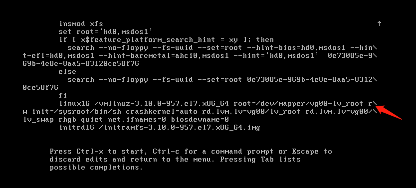 2、 继续按e进入编辑模式,找到ro crashkernel=auto xxx项,将ro改成rw init=/sysroot/bin/sh,如图所示: