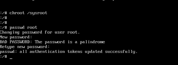 5、 执行命令chroot /sysroot访问系统,并使用passwd修改root密码,如图所示: