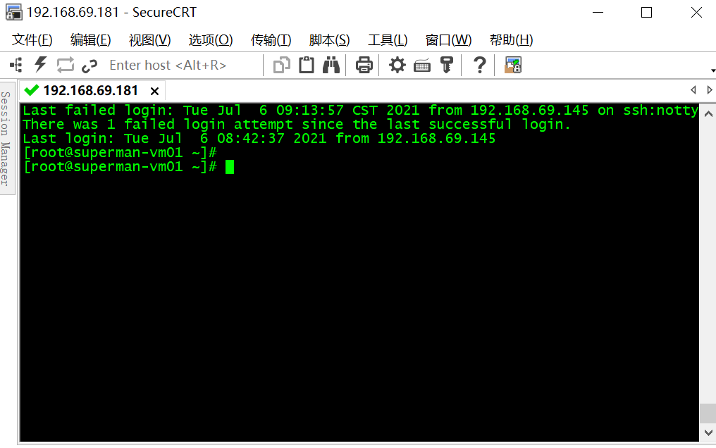 通过SecureCRT远程连接Linux服务器之后,会发现如图3-25所示界面,与服务器本地操作界面一样,在命令行可以执行命令,操作结果与在服务器现场操作是一样。