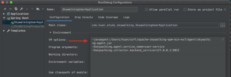 -javaagent:(agentjar包的位置)(eg: /Users/huan/soft/apache-skywalking-apm-bin-es7/agent/skywalking-agent.jar )