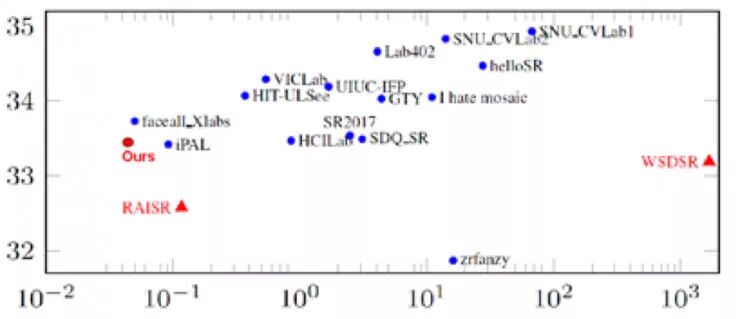 TSR与学术界前沿超分辨率技术对比如下图(NTIRE2017数据,400* 300 放大到 800 * 600,硬件环境:Titan XP workstation)。 可以看到在处理速度与图片效果上,TSR相比别家(包括谷歌的RAISR)都要更佳。