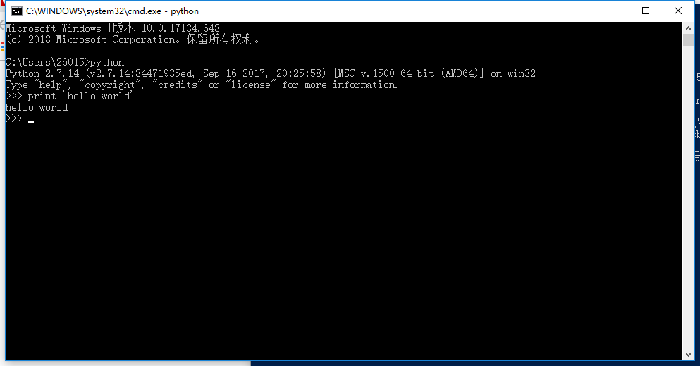 顺便解释一下环境变量:PATH环境变量,就是所有命令会首先去环境变量PATH去找,把bin目录暴露到环境变量,cmd命令行直接输入python.exe,通常省去.exe后缀,直接输入python即可进入Python命令行: