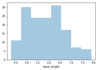 sns.distplot( a=df["sepal_length"], hist=True, kde=False, rug=False );