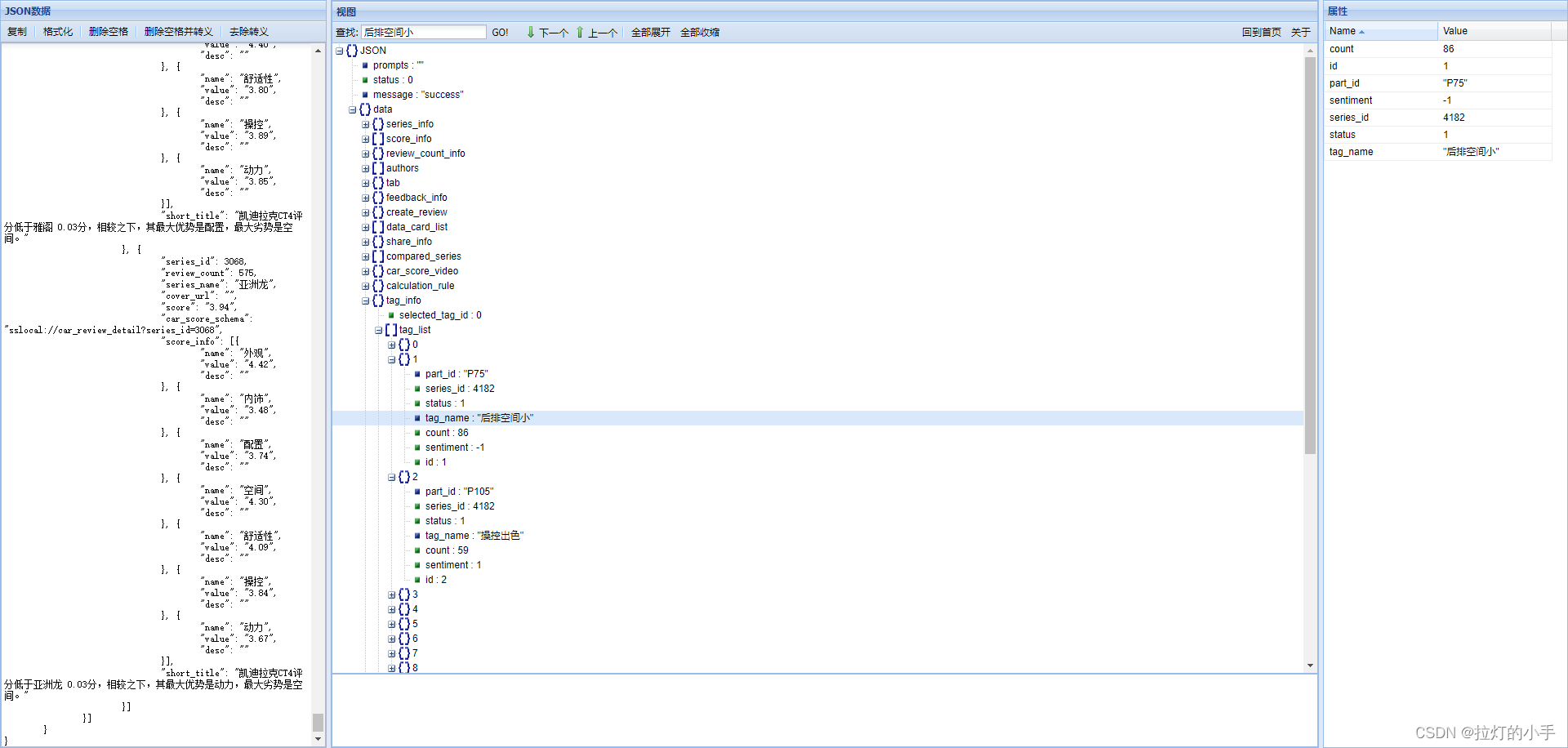 初步查看和页面数据是一致的,看数据结构和具体的数值和页面中的数据很像,Charles界面太小,将数据拷贝至网页中解析,方便分析,分享一个常用的json数据在线解析网站