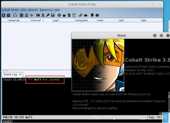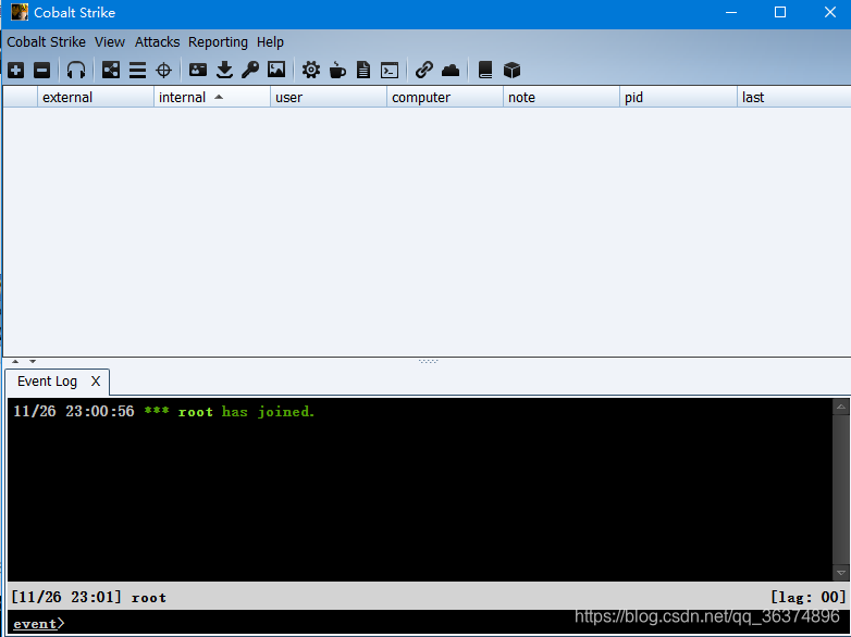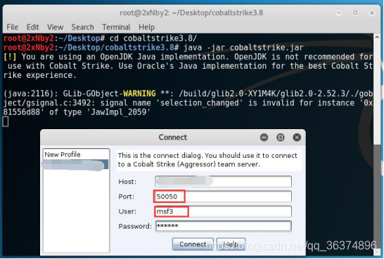 这里简单说一下每个的意思,host为刚才所建立团队服务器的ip地址,port为50050,user随意填,这个为代表你自己的意思,password填写刚才建立团队服务器时所使用的123456,之后点击connect就可以连接到团队服务器中。