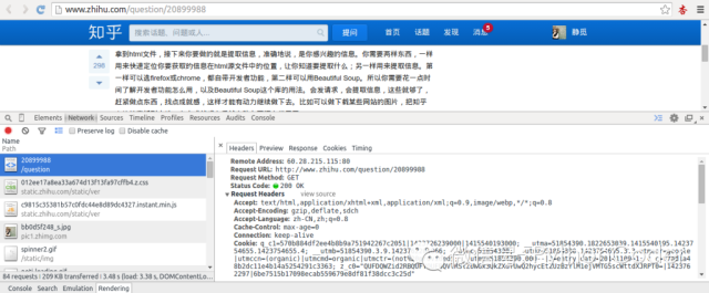 首先,打开我们的浏览器,调试浏览器F12,我用的是Chrome,打开网络监听,示意如下,比如知乎,点登录之后,我们会发现登陆之后界面都变化 了,出现一个新的界面,实质上这个页面包含了许许多多的内容,这些内容也不是一次性就加载完成的,实质上是执行了好多次请求,一般是首先请求HTML文 件,然后加载JS,CSS 等等,经过多次请求之后,网页的骨架和肌肉全了,整个网页的效果也就出来了。