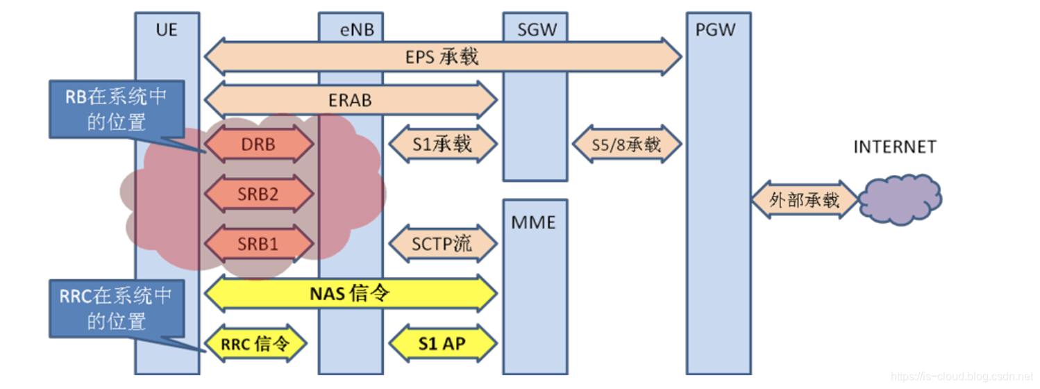 回过头来继续看这张图,EPS Bearer 可以被拆分为三段:Radio Bearer(无线承载,RB)、S1 Bearer 和 S5 Bearer。其中,RB + S1 Bearer 的组合称为 E-RAB。