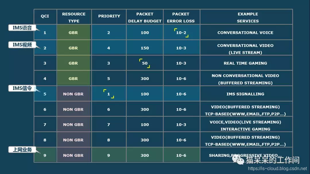 - Non-GBR:QCI 5-9,指的是在网络拥挤的情况下,业务需要承受低速率的要求,由于 Non-GBR 承载不需要占用固定的网络资源,因而可以长时间地建立。常用于 Default Bearer,也可以用于 Dedicated Bearer。例如:上网业务。