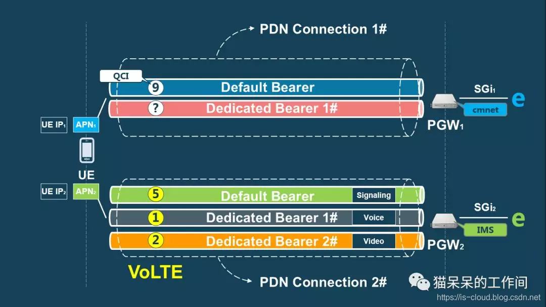 以 IMS 的 VoLTE 业务为例,APN IMS 的 Default Bearer QCI=5,是 Non-GBR 类型;而 VoLTE 业务中 IMS 语音使用的 Dedicated Bearer QCI=1、IMS 视频使用的 Dedicated Bearer QCI=2,都是 GBR 类型,这是因为 VoLTE 需要稳定的带宽来传输 IMS 语音或 IMS 视频数据。