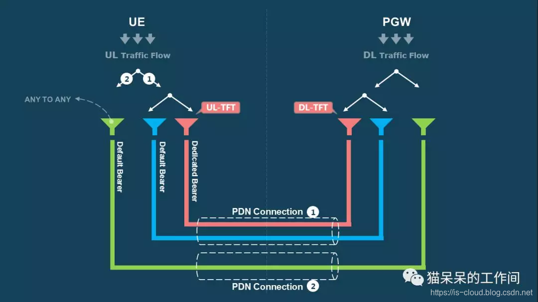 现在我们姑且理解为:UE 会拥有多个 UL TFT,匹配 UL TFT 中的 PF 的 SDF 就会使用 PDN Connection 中与该 TFT 对应的 EPS Bearer 来传输上行数据;PGW 也会拥有多个 DL TFT,匹配 DL TFT 中的 PF 的 SDF 就会使用 PDN Connection 中与该 TFT 对应的 ESP Bearer 来传输下行数据。