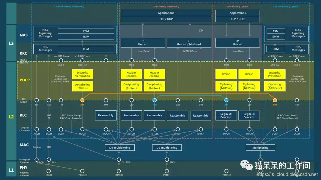 但实际上,RB 在协议层面的实体主要只会看 PDCP(Packet Data Convergence Protocol,分组数据汇聚协议)。上层(e.g. UE APP)将业务数据交给 PDCP 实体,经过逐层封装(以及分段、映射、复用)后经 PHY 层发送,接收方(一般是 eNB)再逐层解封,最后由对端 PDCP 实体将业务数据交给上层。从上层的角度看,提供传送数据服务的 PDCP 实体,就是 RB,而并不了解 PDCP 的细节。