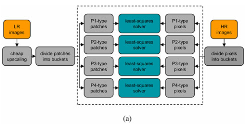 其中,设置梯度Angle范围为[0,180],分为24段;梯度Strength和梯度Coherence范围为[0, 1.0],范围各分成3段。每个像素类的LR patch及其对应的HR patch可以分24x3x3=216梯度特征类中