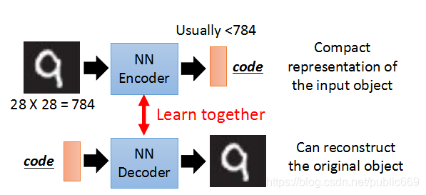 例如,Mnist的一张图片大小为784维,将图片放到Encoder中进行压缩,编码code使得维度小于784维度,之后可以将code放进Decoder中进行重建,可以产生同之前相似的图片。