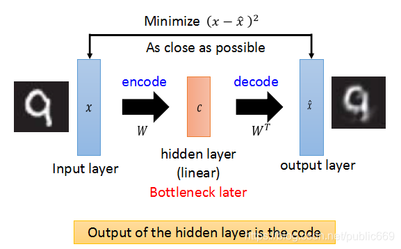 所以,我们也可以把PCA理解成为一个线性的autoencoder,W就是encode的作用,w的转置就是decode的作用,最后的目的是decode的结果和原始图片越接近越好。