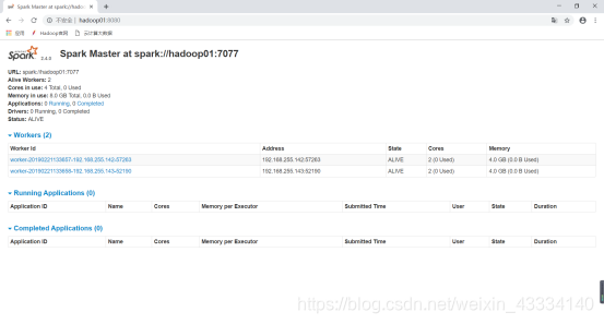 ⑦进入Master所在机器的8080端口,可以查看Worker的信息