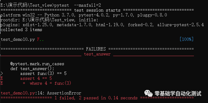 上面我们介绍-x, 它的作用是用例执行失败或者错误,就会停止执行。如果希望pytest失败几次后再停止,则可以使用--maxfail选项,指定执行失败次数。 如设置--maxfail=2,则需要遇到两次错误才会停止。