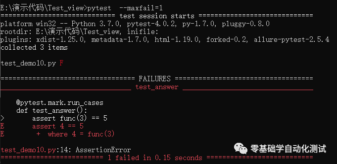 由于只有一个错误,所有可以正常执行后面的用例。下图设置--maxfail=1,遇到失败或者错误后,后面的用例不再执行。