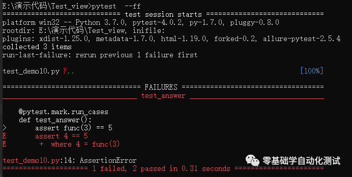 运行所有测试,但首先运行上次运行失败的测试(这可能会重新测试,从而导致重复的fixture setup/teardown)