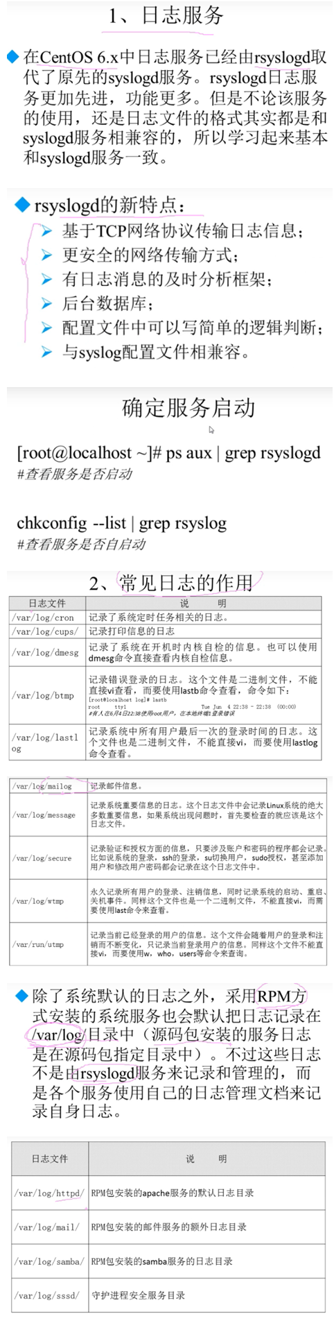 1. 简介 (1) 日志服务 在CentOS 6.x中日志服务已经由rsyslogd取代了原先的syslogd服务.rsyslogd日志服务更加先进,功能更多.但是不论该服务的使用,还是日志文件的格式 ...