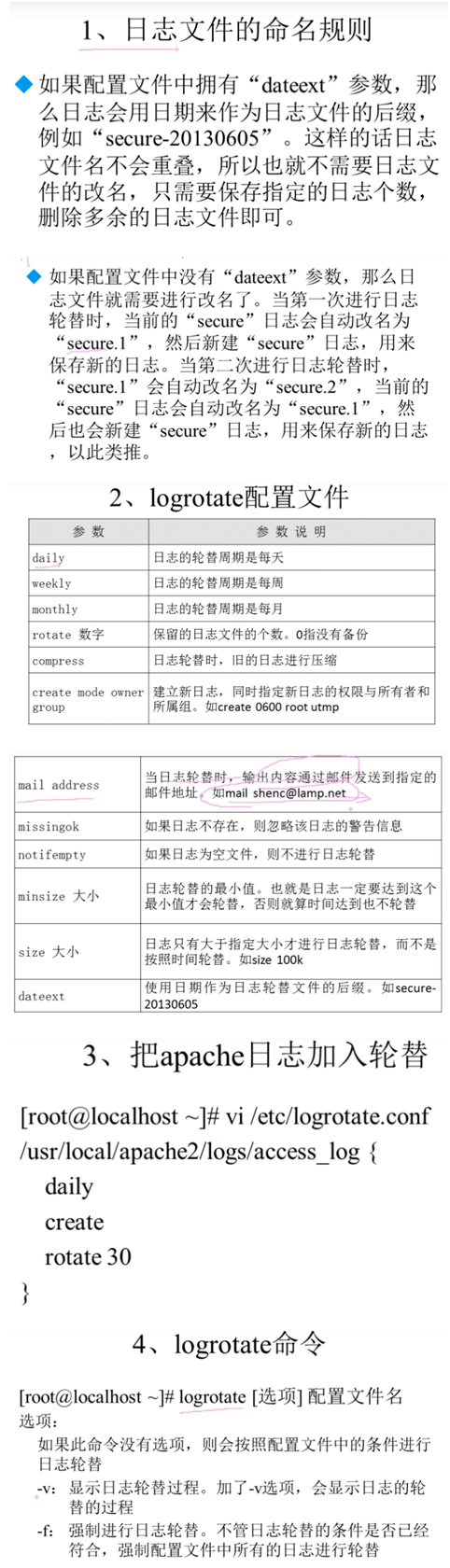 目录 1.日志文件的命名规则 2.logrotate配置文件说明 3.logrotate配置文件的主要参数 1.日志文件的命名规则 日志轮替最主要的作用就是把旧的日志文件移动并改名,同时建立新的空日志 ...