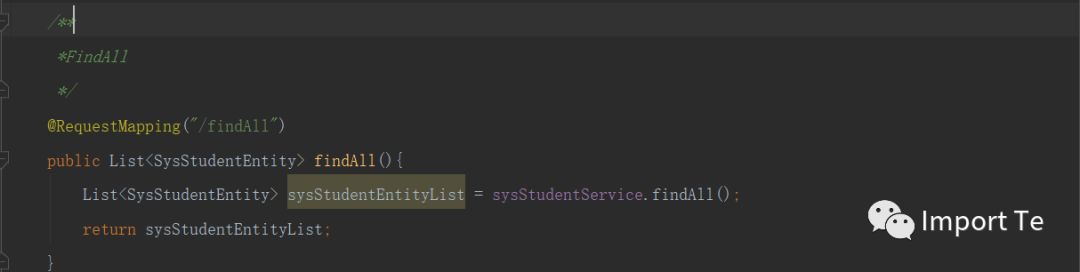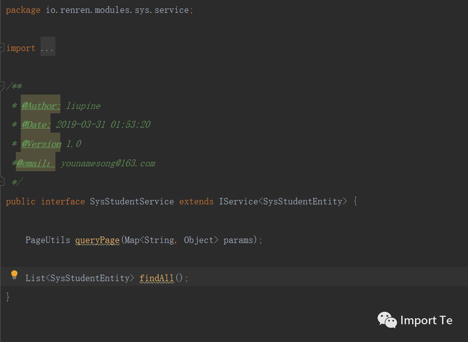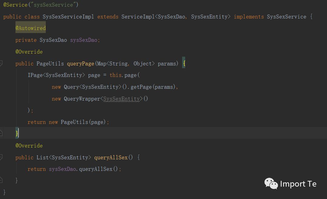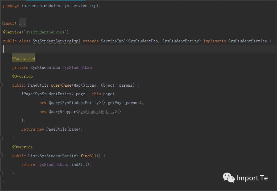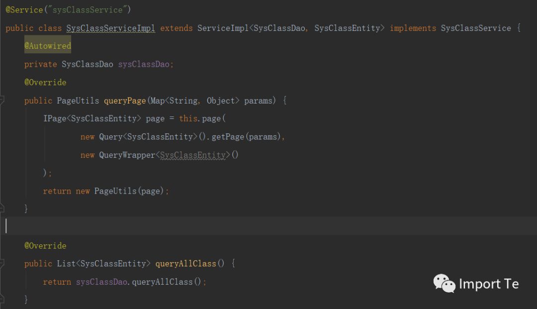 @Autowired注解,它可以对成员变量、方法及构造函数进行标注,完成自动装配工作,并消除GetSet方法,其实在启动springIOC时容器自动装载了一个Autowired的后置处理器,当容器扫描到@Autowired,就会自动查找需要的bean,并装配该对象的属性。这里实现Service层接口queryPage();findAll();