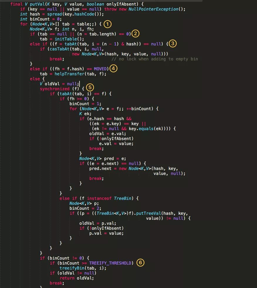 即为当前 key 定位出的 Node,如果为空表示当前位置可以写入数据,利用 CAS 尝试写入,失败则自旋保证成功。如果当前位置的